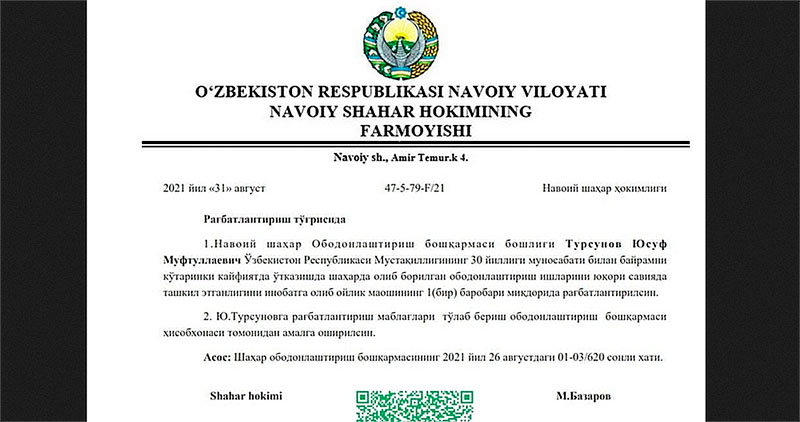 Навоий шаҳар ҳокимининг Турсуновни мукофотлашга оид фармойиши. Kun.uz сайти фотосурати